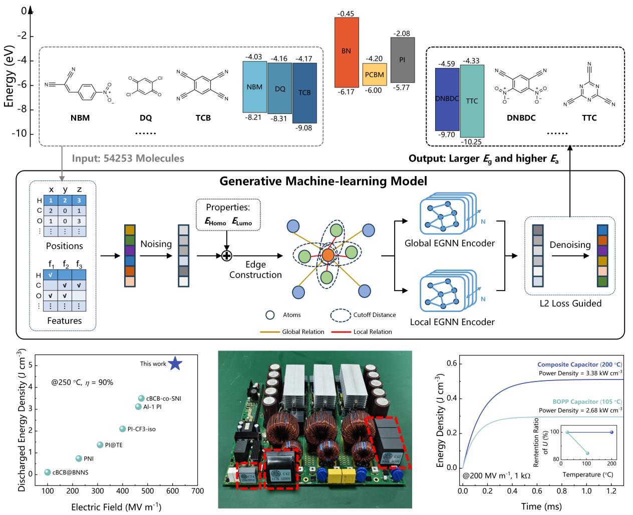 在新能源技术迅猛发展的时代,尤其在新能源汽车、高压直流输电、电磁装备等高温高场应用场景中,提升聚合物薄膜电容器的高温储能性能成为研发核心。在聚合物基体中引入宽带隙(Eg)、高电子亲合能(Ea)的小分子填料,是提升其高温储能密度的有效策略。然而,搜寻兼具宽Eg和高Ea的小分子是一项费时费力的挑战。